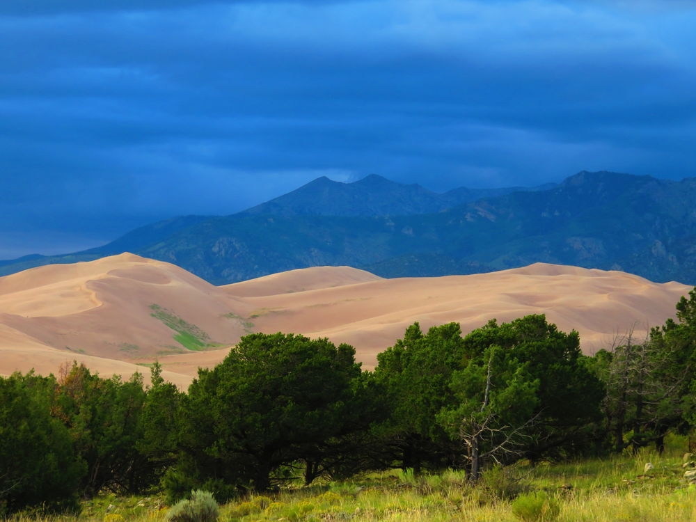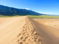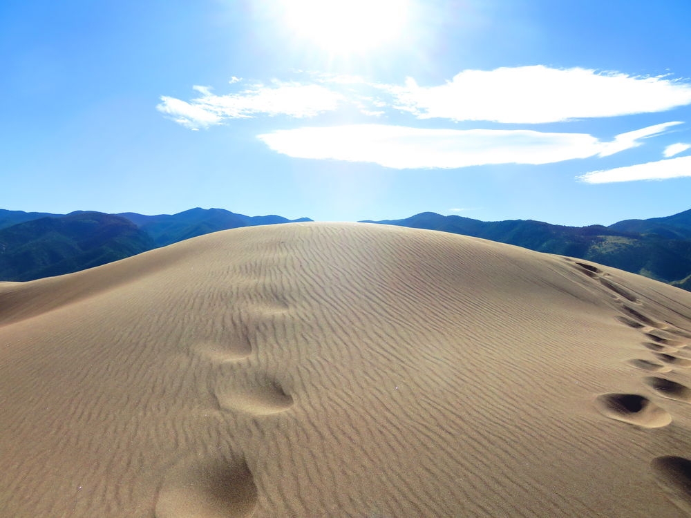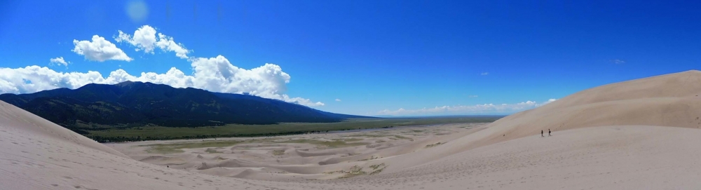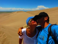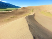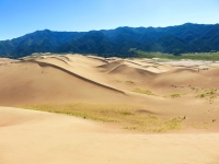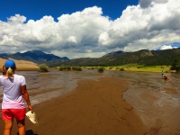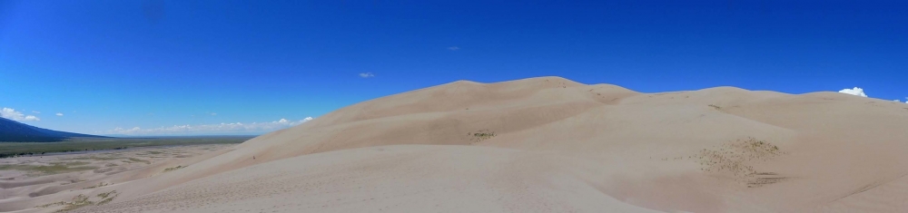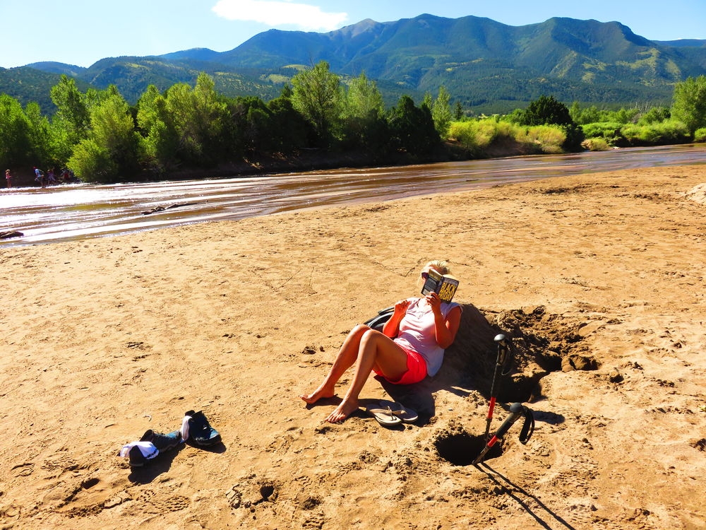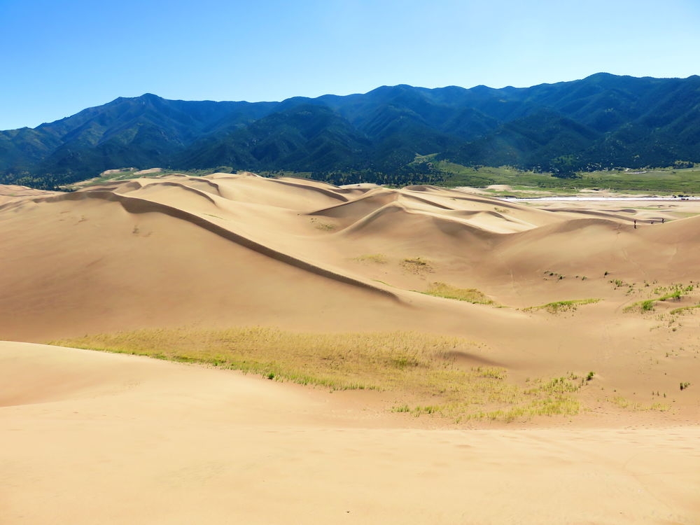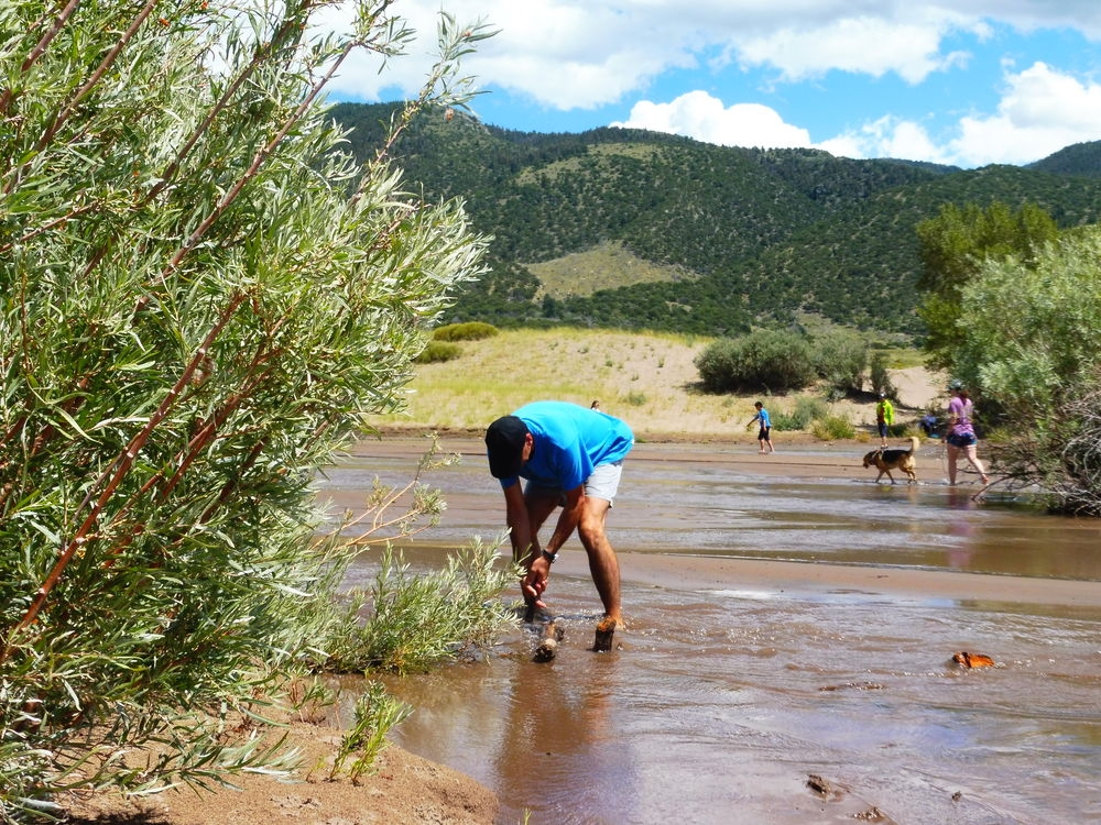 Au réveil Eric a envie de remonter en haut des dunes, moi j’ai envie de bouquiner. On met Fleurette sur le parking au pied des dunes et pendant qu’Eric transpire je m’installe à côté du ruisseau avec mon livre acheté à Salida. Déjà à cette heure-ci le soleil tape fort, il n’y a pas encore beaucoup de monde, c’est agréable. Eric revient une bonne heure après tout content de sa balade matinale.