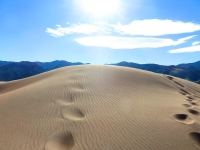 Déjà sur la route on voit les dunes, avec les montagnes en arrière-plan ils ont l’air petites. On arrive vers 10h dans le park, j’ai repéré un camping juste avant l’entrée du park, cher certes mais nous avons besoin d’eau et de faire la vidange. Le camping dans le park même ne dispose pas de ces services. Pour l’instant on rentre et on verra après. Presque de suite en rentrant dans le parc, on tombe sur un « Dump », un endroit pour camping-cars pour prendre de l’eau, vider les eaux grises et noires. C’est génial, il y a tout ce qu’il faut ici. Du coup on rentre dans le camping du parc pour voir s’il y reste une place. On a de la chance, on met 20$ dans un enveloppe et l’emplacement n° 88 est pour nous !