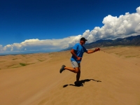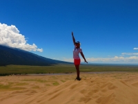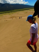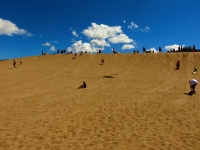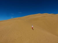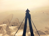 . Pas facile de monter dans le sable sans un pet d’ombre. On n’est pas beaucoup à dépasser les premières dunes. Pendant qu’on se repose en haut d’une dune on voit un jeune qui monte avec sa planche pieds nus !! Le sable est brulant. On le voit courir, creuser avec son surf dans le sable pour trouver un peu de fraicheur pour ses pieds. Complètement fou. Quand il arrive à notre hauteur on comprend que c’est ici qu’il va descendre. Il explique que c’est sa première fois, ça ressemble un peu au snow ou wakeboard mais il n’a jamais fait ni l’un ni l’autre