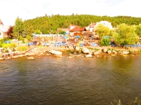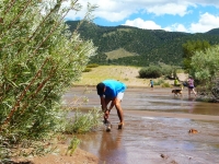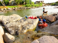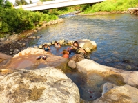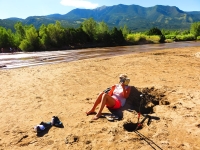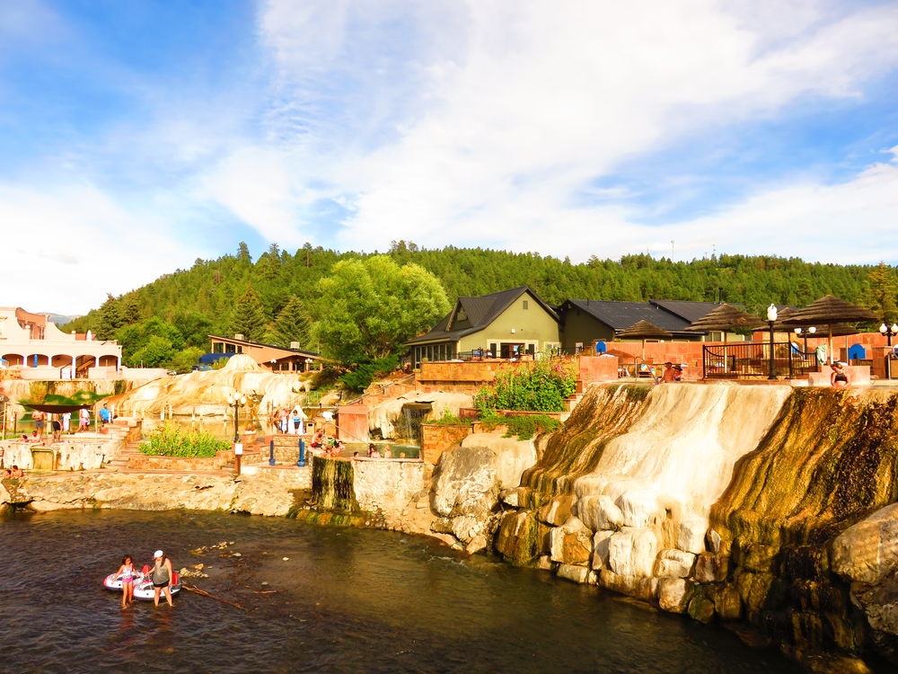 Durango se trouve à 150 miles on n’arrivera pas ce soir, à 17h on passe par le village Pagosa Spring. En passant Eric le trouve joli, on continue un peu et passent devant un Walmart. 17h c’est un peu trop pour s’arrêter donc on retourne à Pagosa Spring pour le visiter. Eric avait raison c’est très joli. Il y a des sources chaudes qui se jette dans une rivière à faible courant. Des petits bassins avec l’eau chaude se forment au bord de la rivière et des gens en profitent. Les enfants (et adultes) s’amusent avec des bouées en se laissant emporter par le courant. On passe un bon moment au bord de la rivière avec les pieds dans une source chaude à regarder des familles s’amuser.