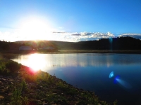 Même moi je trouve que c’est un peu tôt pour partir, pourtant je n’arrive plus à m’endormir. Vers 6h30 une voiture arrive, personne ne nous dit de quitter les lieux mais pour moi c’est le signe de départ. Pour montrer ma bonne foi je propose quand même à Eric de déjeuner d’abord, il me connait et dit qu’on déjeunera un peu plus loin. Me voilà soulagée. On roule dix minutes avant de s’arrêter au bord du lac Capote dans une réserve Indienne. Vu l’heure il n’y a personne et le soleil matinal laisse un joli reflet sur le lac. Ça a du bon de se lever tôt finalement. (J’essaie de me trouver une excuse !)