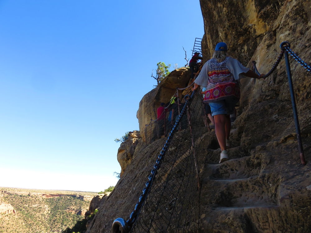 On arrive un peu avant midi au premier site : Chapin Mesa. Ce site consiste entre autre d’un musée et d’une boucle de 10miles à parcourir en voiture. On commence avec le musée, une belle collection d’objets concernant des Indiens de Mesa Verde. Nous en faisons le tour en 15 min. J’avais lu dans la brochure qu’il est possible de visiter des habitations construites dans les falaises avec un guide. Pas possible d’y aller seul. Le prix est de $5 per personne et il faut acheter les billets ici.