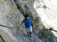 Après quelques instructions de sécurité elle nous guide vers le site. D’abord on descend un escalier en fer, pas dangereux mais je plains ceux qui ont des vertiges, ensuite il faut grimper une échelle en bois de 10m de haut pour arriver à l’habitation creusée dans la falaise. Le tout est assez impressionnant surtout quand on s’imagine comment des gens ont vécu ici. La sortie se fait par un tunnel très étroit et bas. Il faut y passer à quatre pattes. Il fait que quelques mètres, pas le temps de devenir claustrophobe.