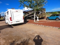 Il fait très beau quand on se réveille. Hier soir quand je dormais Eric à déplacé Fleurette. Notre voisin avait un générateur qu’il a laissé tourner toute la nuit. Aux campings il faut les éteindre à 20h mais ici tout le monde fait ce qu’il veut. Je dors avec des bouchons ça ne me gêne pas, Eric ne pouvant pas s’endormir s’est levé pour faire 100m sur le parking.