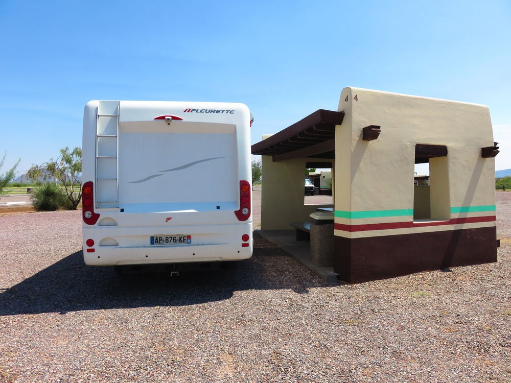 Vers midi on s’arrête pour faire le plein de courses, à Walmart bien sûr. Faut pas changer une équipe qui gagne! Les galettes nous ont coupé la faim et on continue la route avant de nous arrêter à une aire de repos géniale. Sur le parking se trouve de petits abris avec une table, on gare fleurette devant et ça nous permets de manger relativement au frais.