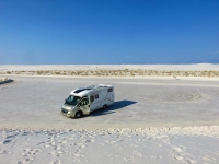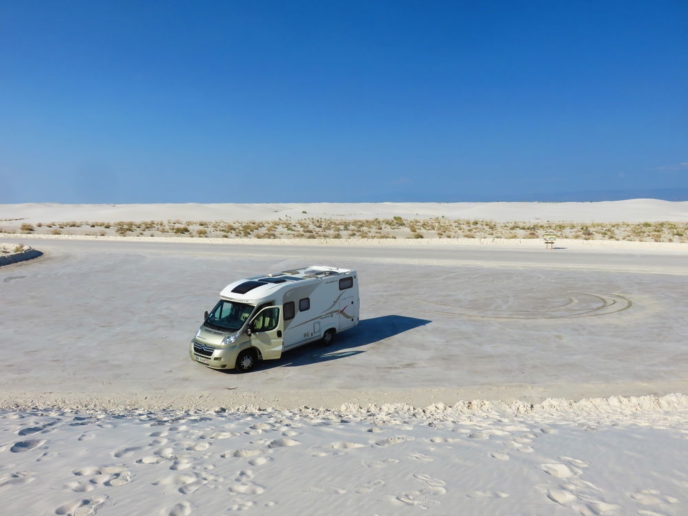 Après le plein d’eau on met le cap sur White Sands National Monument à environ 5h de route. Le frigo est plus que vide, même si on l’a laissé tourner pendant notre absence. Au bout d’une heure de route nous avons faim, il nous reste un paquet de galettes qu’on vide complètement en rien de temps. Adieu les bénéfices du footing de ce matin