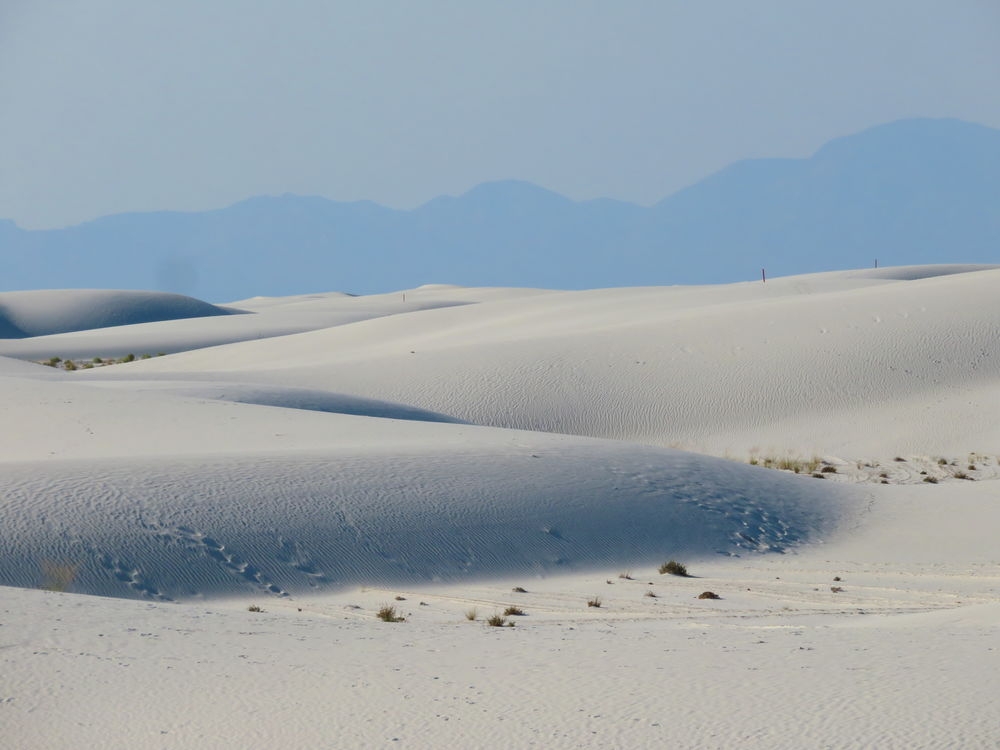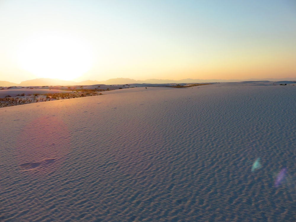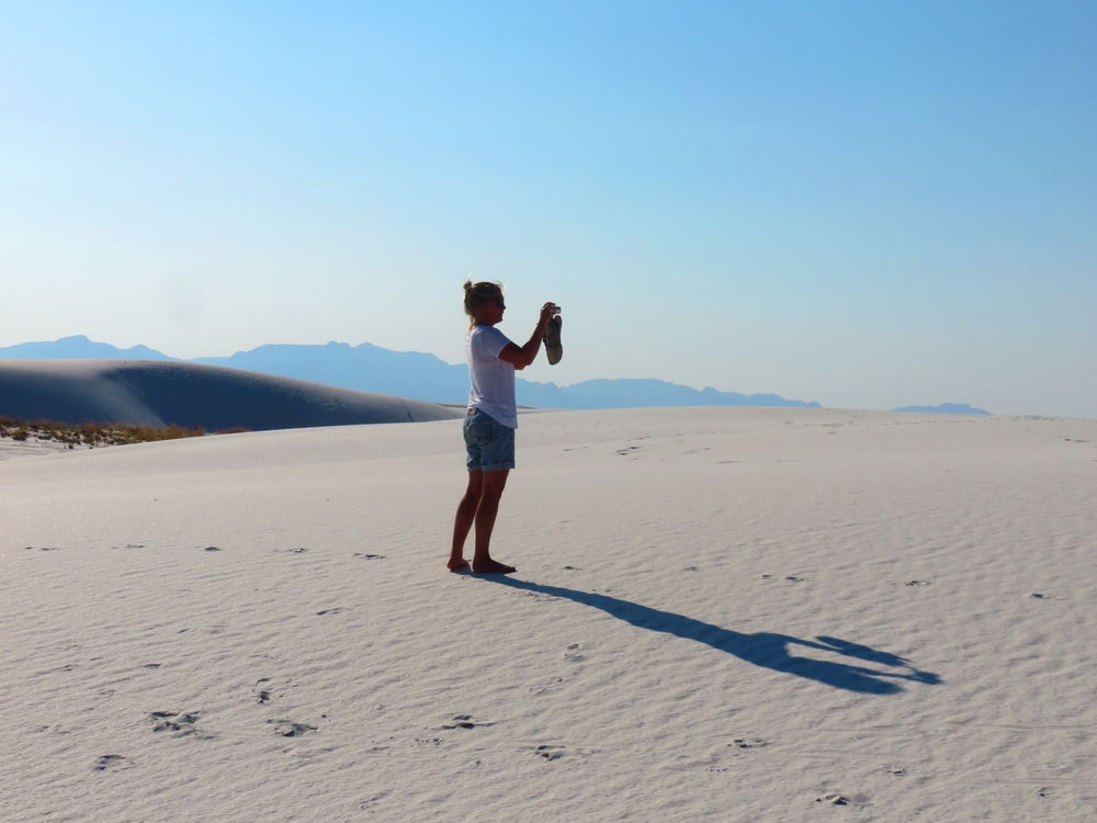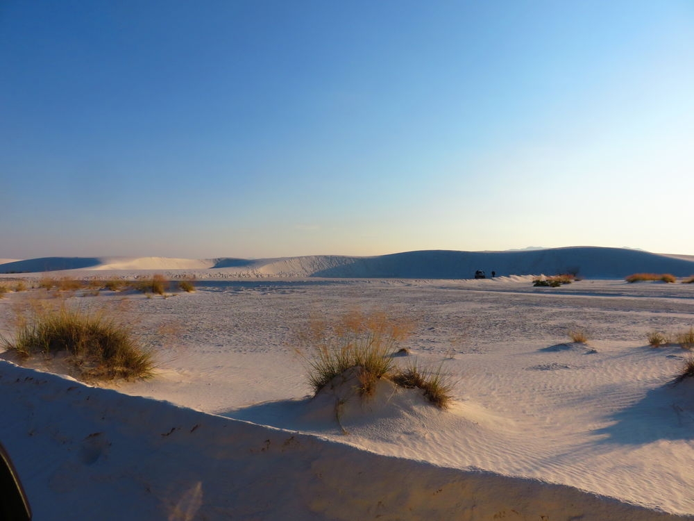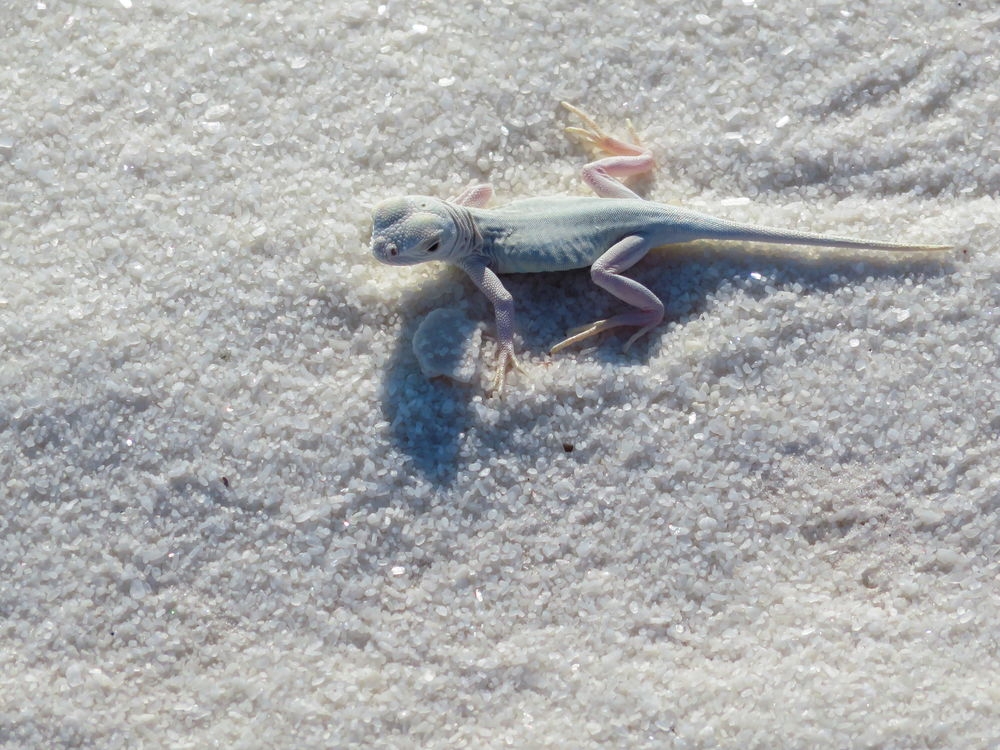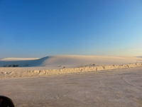 C’est parti pour la visite en voiture. On roule entre les dunes blanches couver de végétation. C’est joli sans plus. Tout d’un coup le paysage change. La végétation disparaît et devant nous des dunes d’un blanc immaculé, on se croit dans la neige. Même la route est couverte de sable blanc. C’est vraiment très très beau. Il y a très peu de monde, certainement dû à l’heure tardive mais aussi à la fin de saison. En tout cas ça nous arrange. On continue à rouler pour s’arrêter au point de départ de la ballade. Nous faisons quelques dizaines de mètres, contrairement à ce qu’on pense le sable est frais et nous enlevons nos chaussures. On marche un peu plus et montons sur une petite colline ou on croise un petit lézard aussi blanc que le sable.