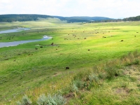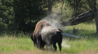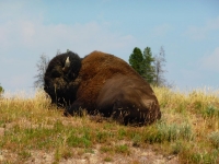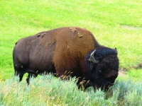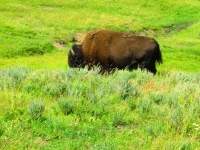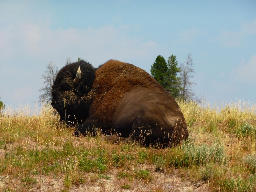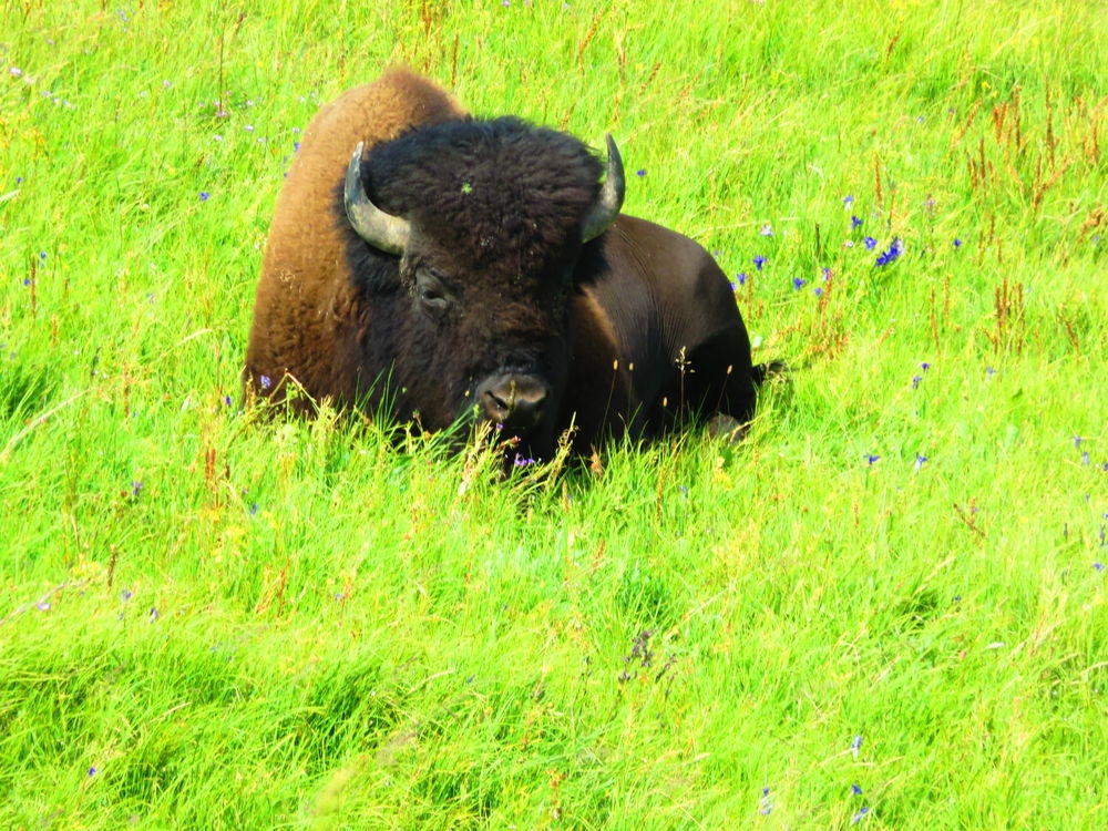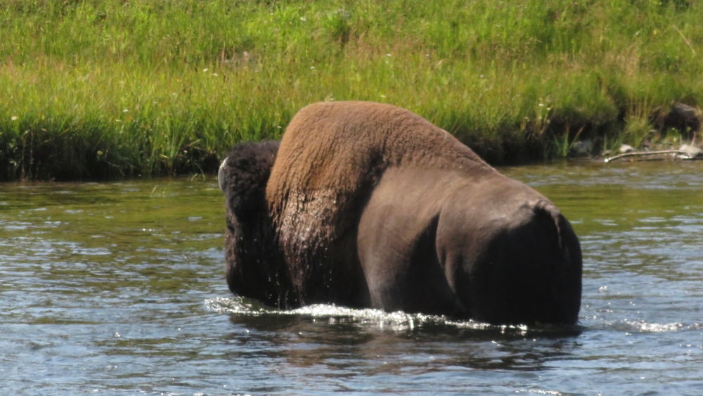 Au bout d’une trentaine de minutes on voit des gens sur une aire prendre des photos, un bison est en train de se balader tranquillement dans l’eau. On s’arrête pour prendre quelques photos. Cette bête est énorme, je me promets de doubler ma vigilance sur la route car si on prend ça sur le capot c’est directement retour en France.