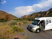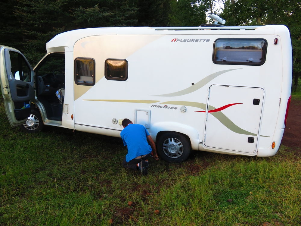 Encore deux heures de route et il est déjà 17H. Une heure plus tard il commence à faire des gouttes. Sans lanterneau ça craint. Devant nous quelques nuages menacent, on décide de prendre le premier camping sur la route à $15. Eric pourra fixer le lanterneau et en le couvrant il pourra sécher une nuit de plus.