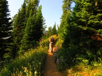 Chaque fois c’est le piège, on pense que le pire est derrière nous qu’il nous reste juste la descente. Mais qu’est-ce que c’est long. On n’en peut plus, j’ai du mal à croire que nous avons monté tout ça ce matin. Sans oublier que la menace d’ours est toujours bien présente. On ne rigole plus avec ça ! On tape avec les bâtons à chaque virage. Il nous faut 2h pour descendre et à peu près 100 « Hi et Hello » pour les personnes qui nous croisent en montant. Je suis contente d’aller dans l’autre sens