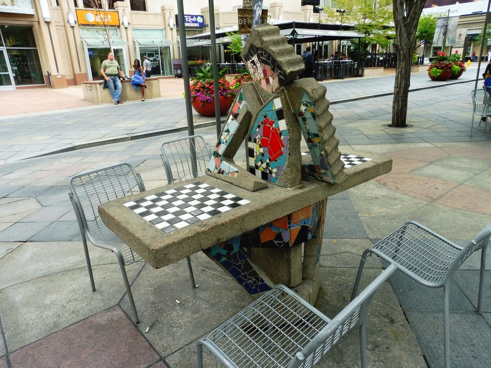 La rue principale de Denver est 16th Street. Elle fait un peu plus de 2 km et une navette gratuite circule en permanence d’un bout à l’autre. Nous la traversons en marchant. J’aime beaucoup cette rue et l’ambiance qu’y règne. Il y a un terreplein central avec de temps en temps un piano coloré sur lequel tout le monde peut jouer. On voit des tables avec des jeux d’échecs sur lesquels des gens sont en train de jouer. Par contre il y a aussi pas mal de mendiants dans des fauteuils roulants. Nous refaisons la rue dans le sens inverse et nous arrêtons à un Starbucks pour boire un verre. Une fois de retour au parking de Pepsi, il est 17h passé.