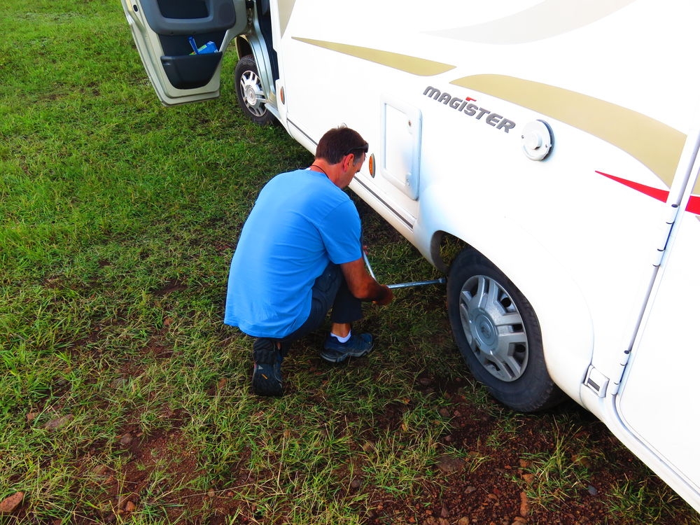 En arrivant Eric essaie de tourner Fleurette de façon à ce que nous soyons bien aplat. Il s’y reprend à plusieurs fois et là Fleurette reste bien coincée dans l’herbe. La roue de secours touche parterre et impossible d’avancer ou de reculer. Ce n’est vraiment pas notre journée, on aurait dû passer une deuxième nuit sur le parking de Walmart !!