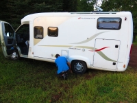 On s’installe il fait des petites gouttes, rien de méchant. En 15 minutes le lanterneau est collé est fixé. On pourrait faire une petite grillade mais vu le froid qu’il fait ce sera pour une prochaine fois. On supporte une polaire, en sachant qu’on a roulé toute la journée avec la clim.