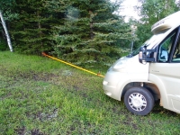 J’essaie encore de trouver quelqu’un et je vois quelques personnes assises devant leur caravane avec un énorme 4x4. Ce sont des personnes un peu âgées, j’explique notre problème. La femme est desuite partante mais son mari hésite un peu. Je vois qu’il n’a pas envie d’abimer son (peut-être) nouveau 4X4. Elle ne lui laisse pas trop le choix et ils arrivent à notre secours. L’affaire est réglée en 2 minutes. Le F350 4X4 un V8 de 350ch aurait pu tirer 3 Fleurettes sans problèmes. On les remercie chaleureusement, sans eux on y serait resté toute la nuit.