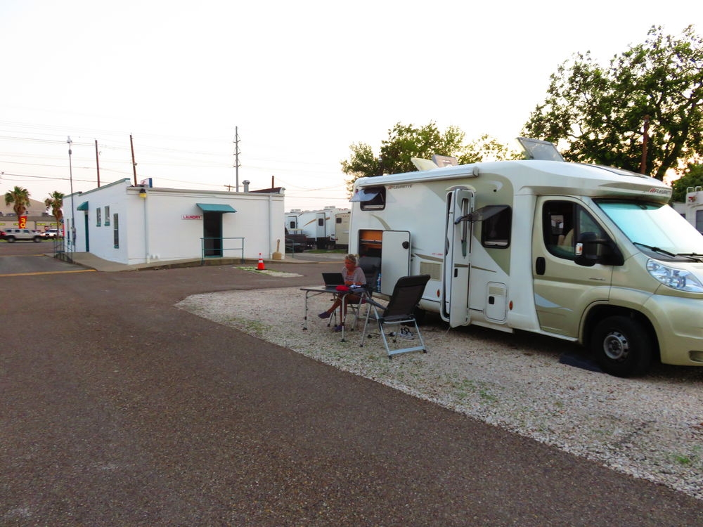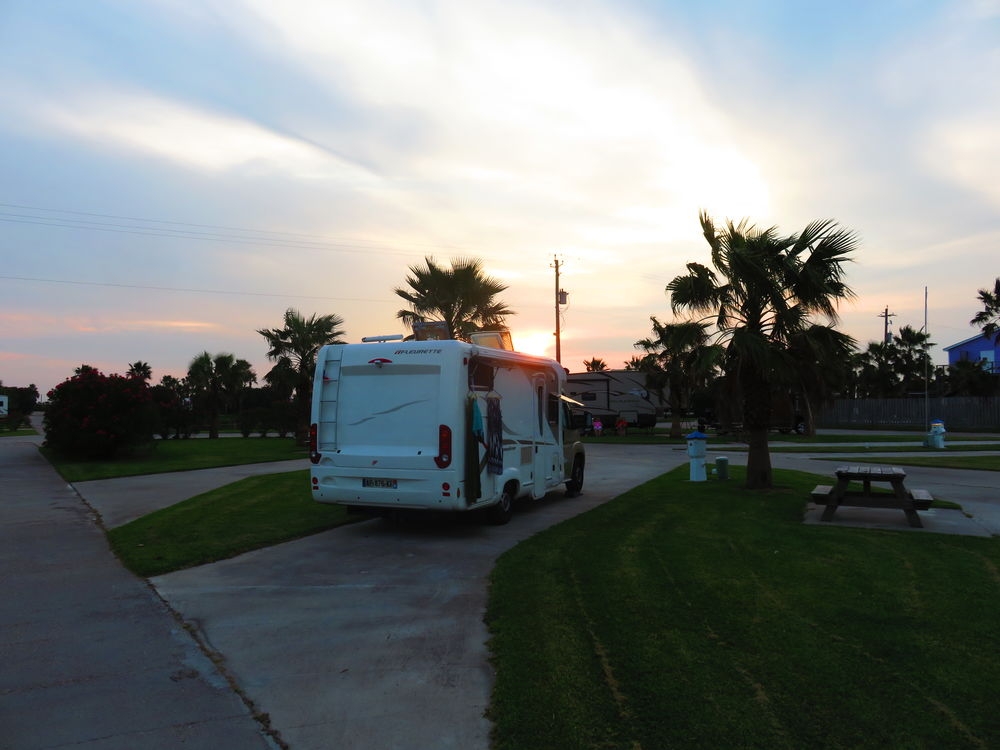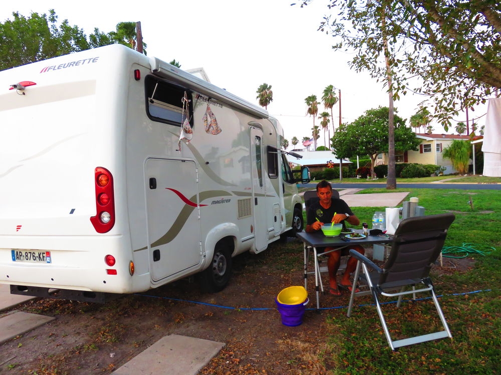 On s’arrête à Corpus Christi dans un RV park quand il nous reste 2h30 à rouler. Ce sera pour demain. Je mens sur le prix à Eric de $10 ($25 au lieu de $35 qui est cher pour une place sur du gravier) Je le lui dirais plus tard une fois que nous sommes installées