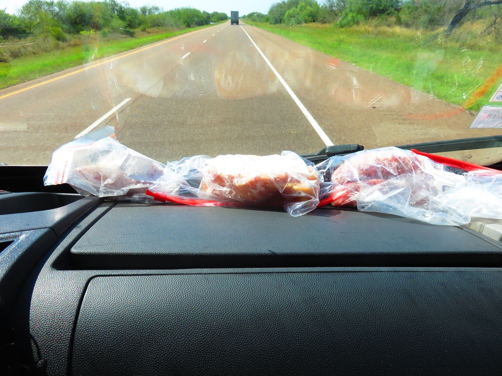 On a un peu plus de 2H de route à faire, on part un peu avant 10H , si on arrive tôt on ira à la piscine. On profite de la chaleur pour décongeler la viande sous le parebrise. Il faut tout manger aujourd'hui