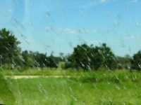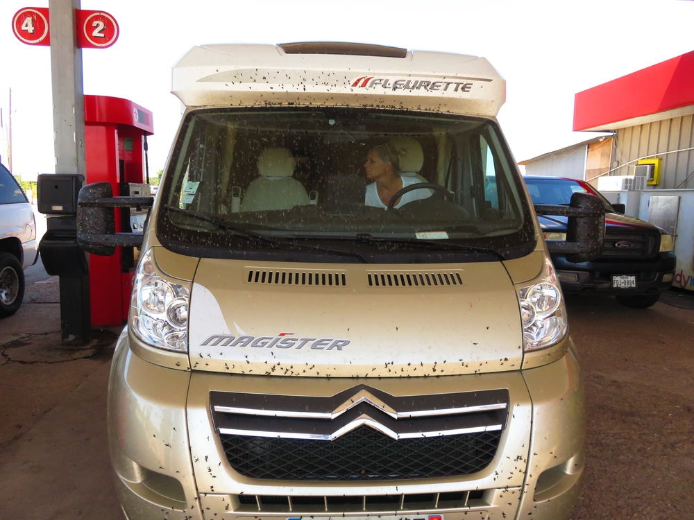 De retour sur l’autoroute on se prend des salves d’insectes. Le parebrise est tellement sale qu’on s’arrête à une pompe d’essence pour le nettoyer.
