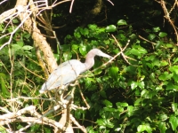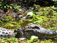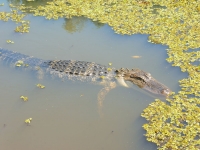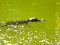 Les deux bateaux s’arrêtent à un endroit et le guide de l’autre bateaux commence à taper dans les mains et de faire des bruits comme on appelle un chien. Tout d’un coup on voit un alligator arriver de loin, attirée par le bruit et certainement plus par la nourriture elle nage vers nous. Elle n’est pas très grande mais c’est quand même impressionnant. Le guide a l’air de bien la connaitre et il la manipule facilement. Il nous présente Maxime.