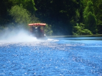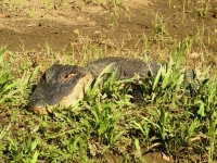 On dit au revoir à Maxime et on poursuit la route. Le paysage reste un peu le même, le bateau va doucement avec parfois quelques accélérations sur les lignes droites. On passe sous l’autoroute, la même sur laquelle on roulait hier. On croise une femelle avec des petits, mais les petits sont tellement petits qu’on a du mal à les voir contre la terre noire. La maman n’est pas contente qu’on vienne si près et refuse même de manger les morceaux de viande que le guide lui jette. On la laisse tranquille, nous partons chercher notre bonheur un peu plus loin.